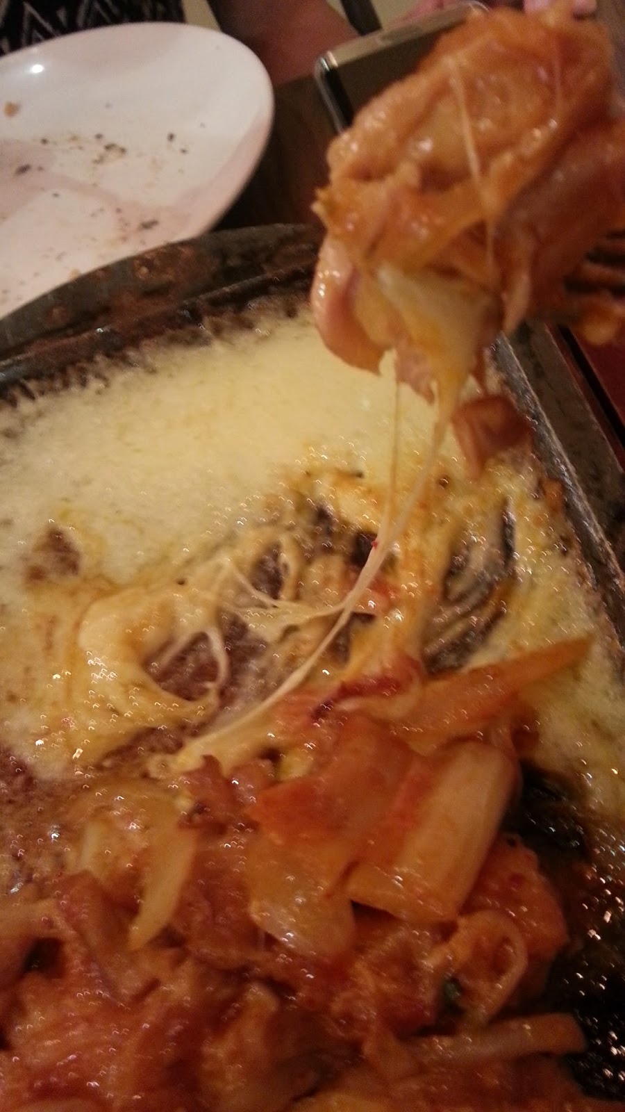 嘆了咖啡,是時候找吃的,見到隔離枱有塊鐵板冒出香噴噴的煙,原來是韓式拉芝士辛辣泡菜雞肉石板飯,看起來很是有意思,一半是肉,一半是芝士,因為熱力令芝士在沸騰着,看起來還真有點像熔岩呢!