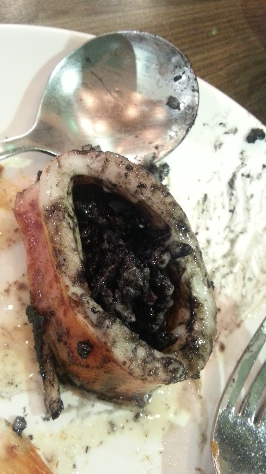 這個好似就嚟要爆的是西班牙鐵板魷魚筒,魷魚筒內釀了墨汁飯,幾有創意!