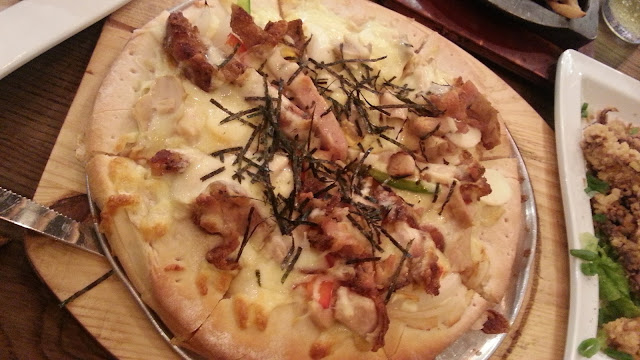 這裡連pizza都有得食,自家製的,我們選擇了和風親子薄餅,親子即雞肉和雞蛋,pizza面還佈滿了厚厚的芝士,一拉出來還有絲的!而且肉夠多,pizza屬厚批,咬落有質感!