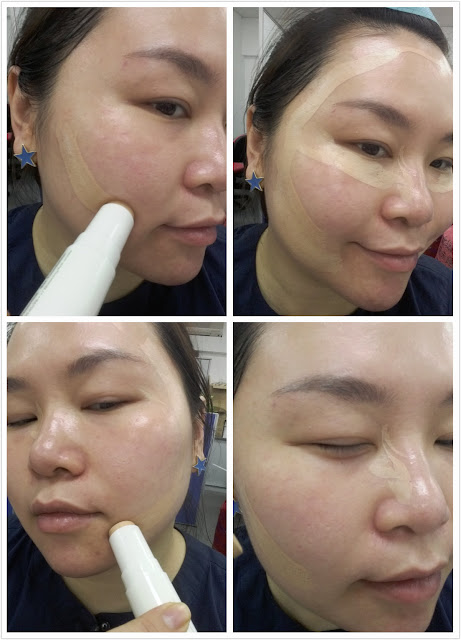 然後將粉條先塗抹在臉上四週,並均勻的延展開