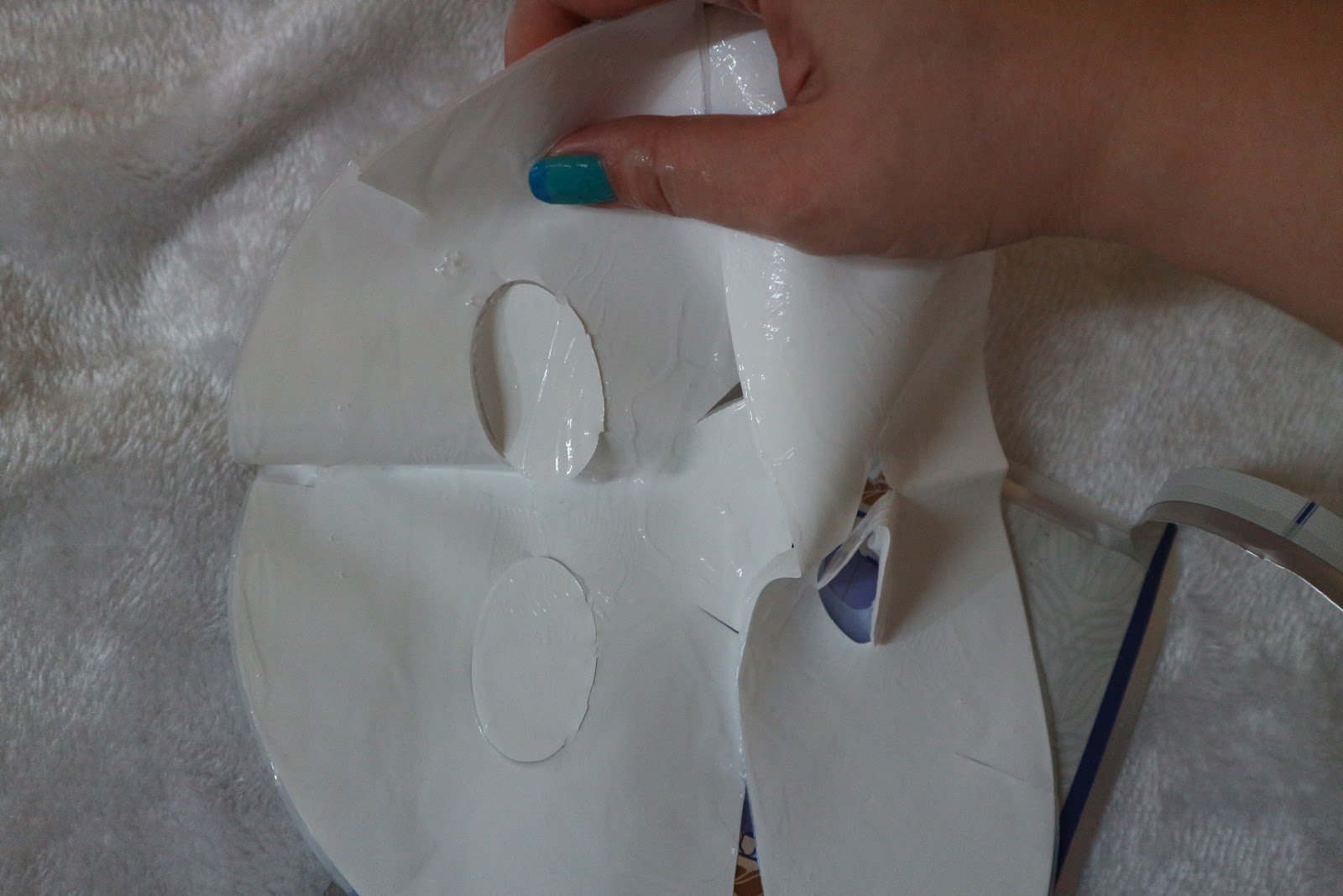 使用時,先將上半部放在臉上,再將下半部放在下巴和頸項。 不過個人認為其實面膜算好大塊, 重疊嘅部分亦算多, 分開上下兩次來敷比較化算! 敷大概15至20分鐘之後便可以將面膜除下。