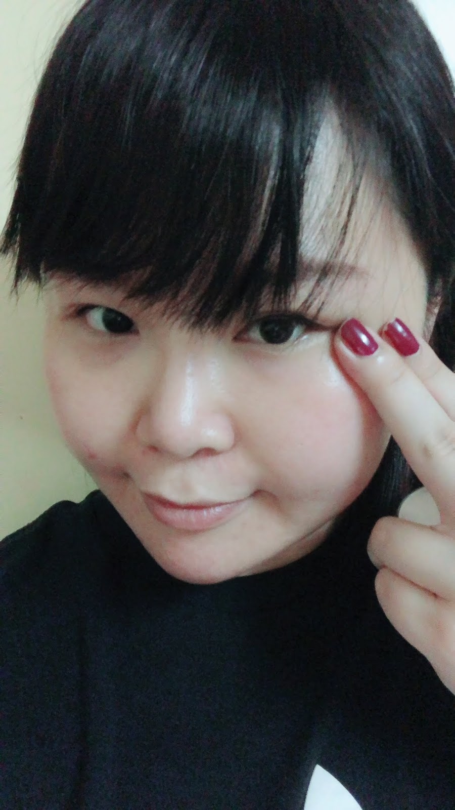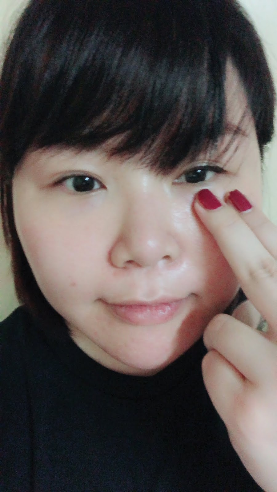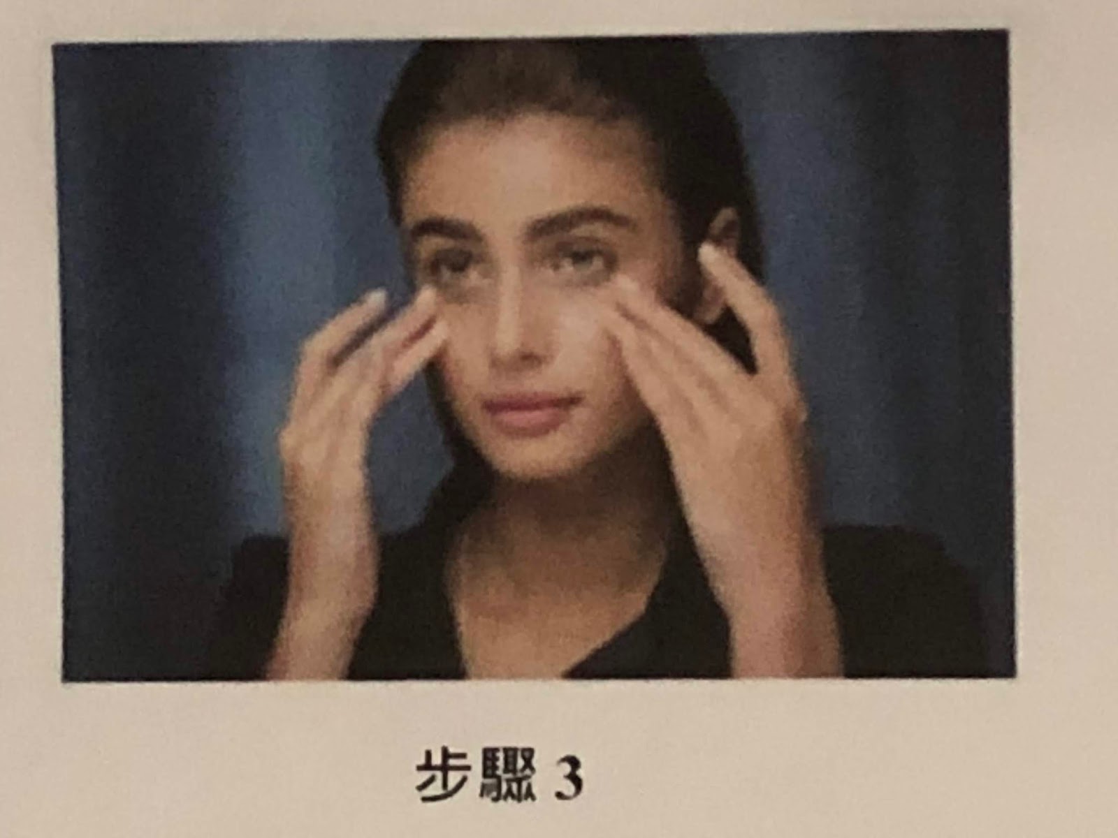 先以中指和無名指沾取適量眼霜, 以指腹在兩邊眼底各輕抹三下,以便均勻塗抹眼霜。